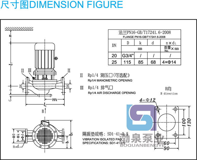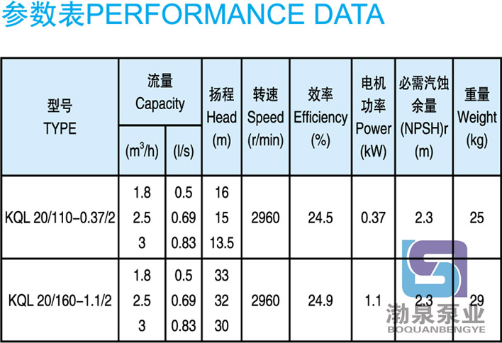 產品介紹 KQL20/110-0.37/2 立式管道離心泵供輸送不含固體顆粒的清水及物理化學性質類似于水的液體之用。同時根據(jù)使用溫度、介質等不同在ISG型管道離心泵基礎上派出適用熱水、高溫、腐蝕性化工泵、油泵。該產品具有同效節(jié)能、噪音低、性能穩(wěn)定等特點。 用途: KQL20/110-0.37/2 立式管道離心泵用于空調、采暖、衛(wèi)生用水、水處理冷卻冷凍系統(tǒng)、液體循環(huán)和供水、增壓及灌溉等領域中無腐蝕的冷水和熱水輸送。 工作條件: 轉速:2960r/min,1480r/min或980r/min 流量范圍:1.8~2000m3/h 揚程:≤127m 介質溫度:-10℃~120℃ 環(huán)境溫度:最大+40℃;海拔高度小于1000m;相對濕度不超過95% 材質: 泵殼、泵蓋、葉輪:鑄鐵 泵軸:45#鋼鍍鉻或不銹鋼(2Cr13) 機械密封動、靜環(huán):浸銻石墨、碳化硅 結構:結構緊湊的單級泵,適用于現(xiàn)代建筑物。 產品特點: KQL20/110-0.37/2 立式管道離心泵結構緊湊、合理,泵與電機直接連接,外形美觀,占地面積小效率高,閉式鑄鐵葉輪,軸承配置合理,葉輪懸臂短,機泵軸完全同心,泵運行平穩(wěn)、可靠,噪音低壽命長,強制環(huán)流沖洗機械密封,免保養(yǎng)、無滲漏。 選型指南: 例如:KQL80/160-7.5/2 或KQW80/160-7.5 KQL標準立式單級離心泵,KQW標準臥式單級離心泵 80進出口直徑 160葉輪名義直徑 7.5/2電機功率/電機極數(shù) ![]() ![]() 因產品生產批次、型號不同,產品圖片及安裝尺寸僅供參考,詳情可聯(lián)系我們的銷售人員了解更多KQL20/110-0.37/2 立式管道離心泵相關信息!