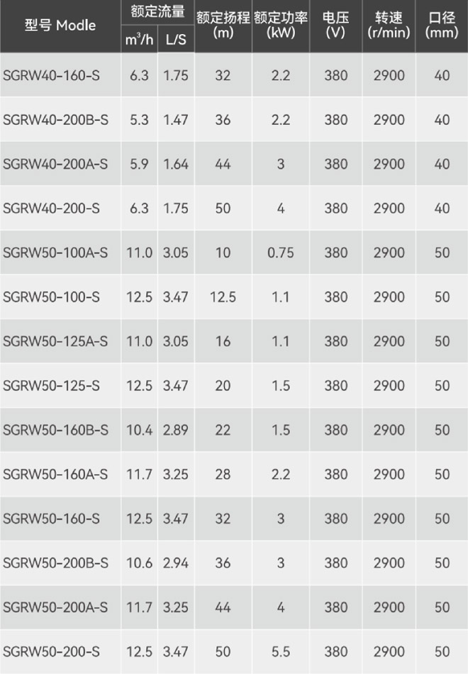 產品介紹 主要用途 SGRW40-160-S不銹鋼臥式管道離心泵可供輸送清水及物理化學性質類似于清水的其他液體之用,適用于工業和城市給排水、高層建筑增壓送水、園林噴灌、消防增壓、遠距離輸送、暖通制冷等冷熱水循環增壓及設備配套、能源、治金、化工、紡織、造紙以及賓館、飯店等鍋爐熱水增壓輸送及城市采暖系統循環用泵,使用介質溫度T≤103℃。 產品特點 1、泵結構緊湊、體積小、外形美觀。 2、進出口徑相同,安裝方便,無需改變管路,可像閥門一樣直接安裝在管路任何部位。 3、機泵同軸,簡化了中間結構,增加了運行的平穩性,葉輪具有很好的動靜平衡,運行時震動小、噪音低,延長了軸承的使用壽命,改善了使用環境。 4、電機采用高效散熱鑄鋁機殼、進口軸承、不銹鋼316焊接轉子軸、氟橡膠“O”形圈、氟橡膠機械密封,過流部件全部采用不銹鋼精密鑄造。 5、維修方便、無須拆卸管道,只要拆下連接架,取出電機及傳動組件即可進行檢修維護。 6、其結構,精心設計,不僅縮小了泵房面積,改善了空間,而且大大節省基建投資。 7、可定制防爆電機,可定制四氟機封。 使用條件 1、適用介質:固體不溶物體積含量不超過單位體積的0.1%,粒度不大于0.2mm。(介質如帶有細小顆粒須采用耐磨式機械密封,請在訂貨時說明。) 2、周圍環境溫度不超過40℃,相對濕度不超過95%,海拔高度不超過1000m; 3、輸送介質的PH值304(4-10)、316(2-13); 4、輸送介質的密度≤1.05×103kg/m3; 5、使用電壓220V/380V,頻率50Hz,電壓波動不超過額定值的±10%。 型號說明 ![]() ![]() 因產品生產批次、型號不同,產品圖片及安裝尺寸僅供參考,詳情可聯系我們的銷售人員了解更多SGRW40-160-S不銹鋼臥式管道離心泵相關信息!
