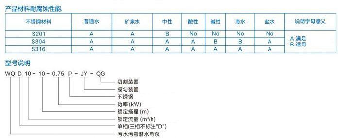 ![]() ![]() 不銹鋼防爆潛水排污泵QWP80-40-7-2.2產(chǎn)品概述/Product Overview 1.國標(biāo)法蘭WQ(D)-S不銹鋼精密鑄造污水污物潛水電泵采用不銹鋼精密鑄造外殼,具有耐腐蝕,環(huán)保型,揚(yáng)程高,流量大等特點(diǎn)。 2.油室采用氟橡膠雙面機(jī)械密封,外室采用單面氟橡膠機(jī)械油封結(jié)構(gòu),有效地減少因骨架油封與軸之間摩擦而造成的密封進(jìn)水問題。 3.電機(jī)采用高溫線,F(xiàn)級絕緣,熱保護(hù)裝置,有效地延長泵的使用壽命。 4.根據(jù)客戶的要求,可帶攪勻裝置,該裝置隨電機(jī)軸旋轉(zhuǎn)產(chǎn)生極強(qiáng)的攪拌力,將污水池內(nèi)的沉積物拌成懸浮物后排出。也可帶切割裝置,能將污水中的長纖維,塑料,紙袋,稻草等雜物碎片后排出。 主要用途/The Main Purpose 不銹鋼耐腐蝕排污泵適用于建筑樓宇、醫(yī)院、住宅小區(qū)、市政工程、道路交通及施工、工廠排污、養(yǎng)殖、藥業(yè)、飲料、海水鹽水、一般腐蝕性介質(zhì)中含有的固體顆粒、長纖維廢水、污水。 使用條件/Conditions Of Use 1.以葉輪中心為準(zhǔn),潛入水下深度不得超過5m; 2.輸送介質(zhì)溫度不高于60C ; 3.輸送介質(zhì)的PH值304(4-10),316(4-13); 4.輸送介質(zhì)的運(yùn)動(dòng)黏度為7x 10~~23 x 10"m?/S 產(chǎn)品材料耐腐蝕性能詳情請參考P36-38 ![]() ![]()