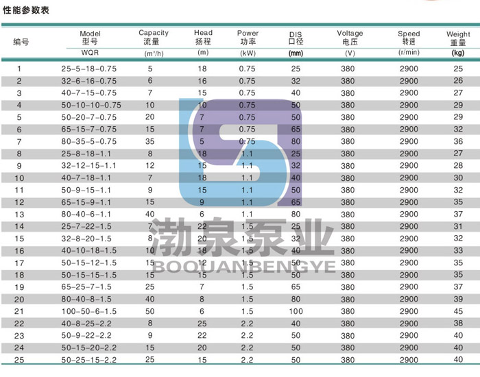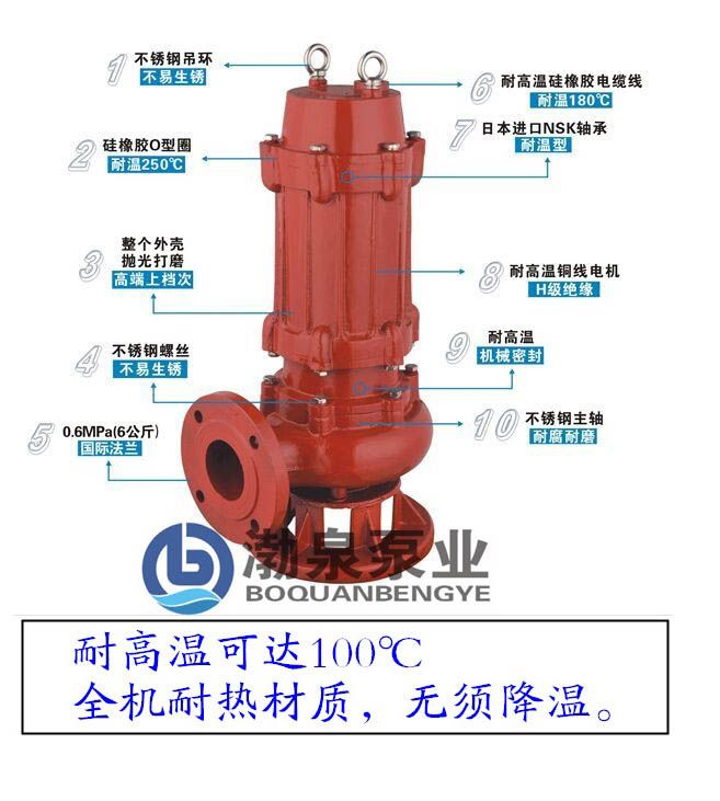 耐高溫排污泵WQR系列型號50WQR10-10-0.75 流量:10立方/小時 揚程:10米 功率:0.75千瓦 材質:鑄鐵(可生產不銹鋼材質) 耐溫100度。具有抽送介質溫度高、安裝移動方便、高效節能、防纏繞、無堵塞等特點。可用于輸送含污物、固體顆粒、纖維的高溫液體介質。 主要用途: 1、市政工程、建筑工地。 2、城市污水處理排放系統。 3、企業、單位廢水排放。 4、住宅區的污水排放,. 5、地鐵、地下室、人防工程, 6、醫院、賓館、高層建筑污水排放。 7、自來水廠、水利工程等。 8、養殖場、化糞池。 9、電廠、鋼鐵廠抽送熱水。
